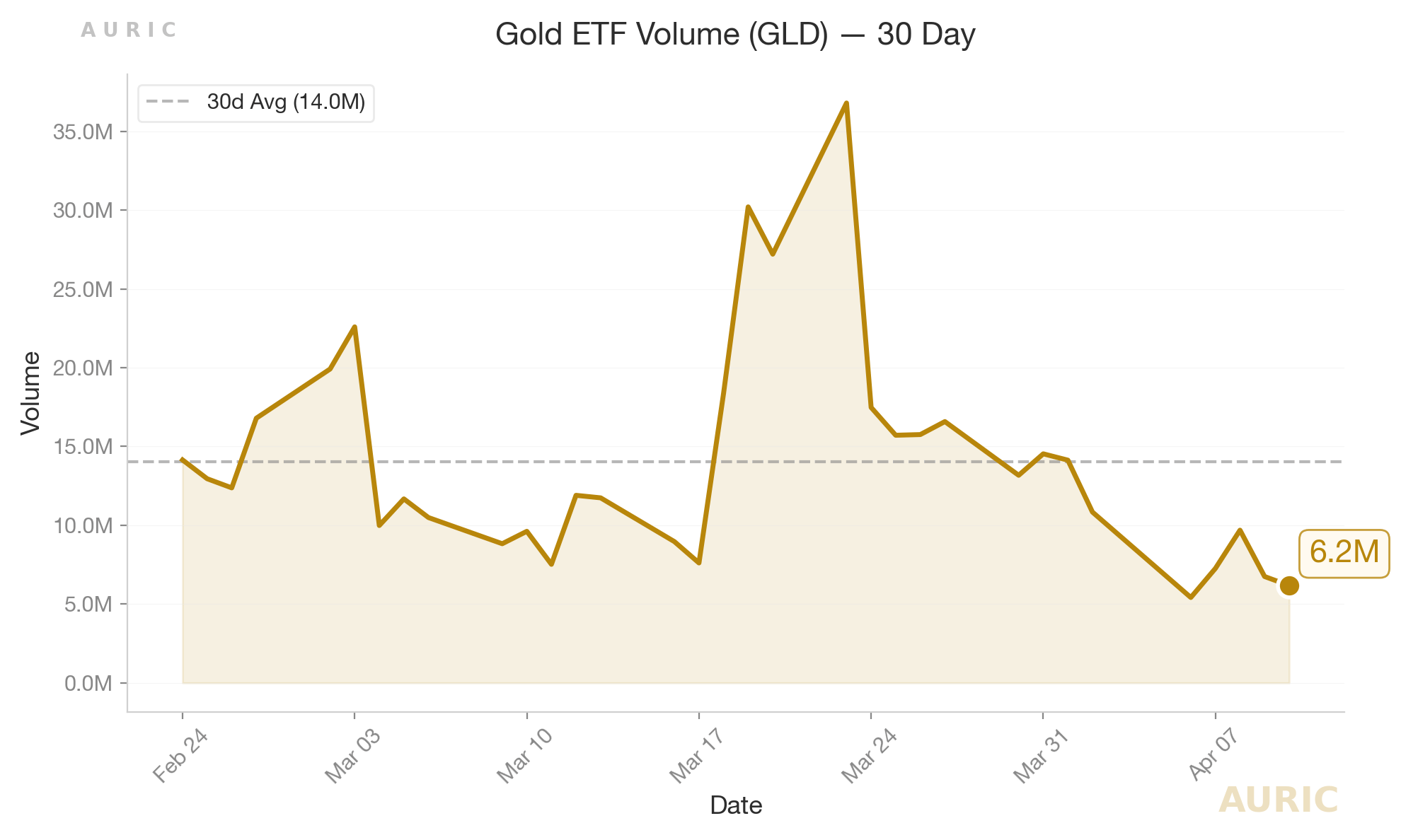 Investor engagement in gold ETFs, as measured by GLD volume, saw a significant decrease this week. The 5-day average volume for GLD fell by 49.0% compared to the prior 5-day average. This declining volume during a rally might suggest that while prices moved up, the conviction behind the rally wasn't broadly supported by new investor inflows, or it could indicate a lack of strong selling pressure from existing holders.